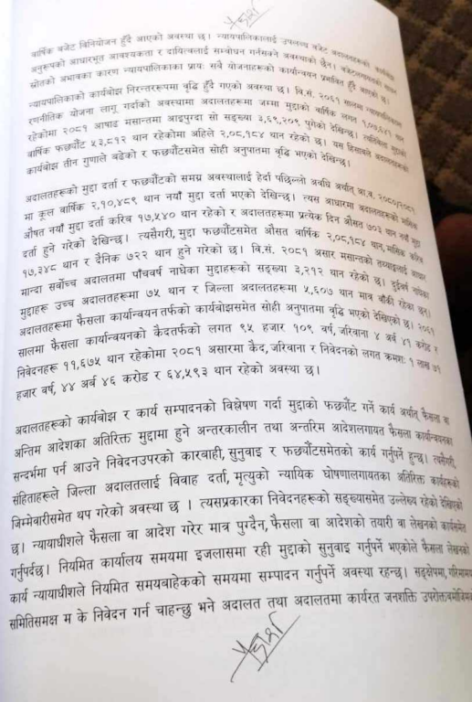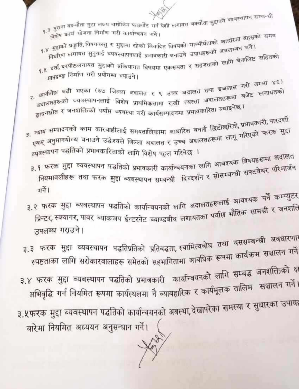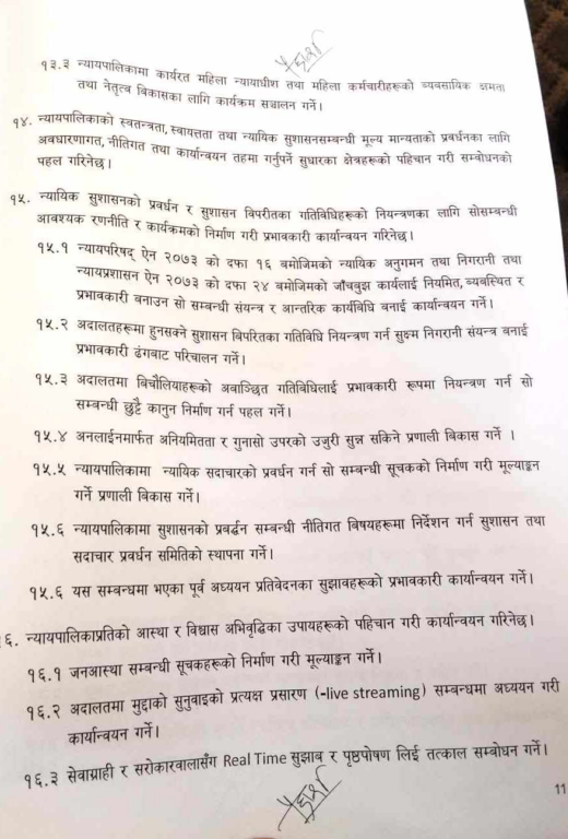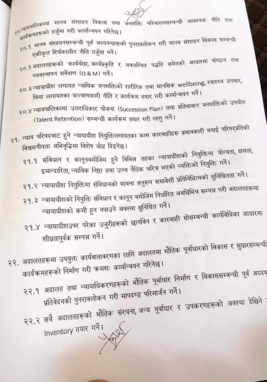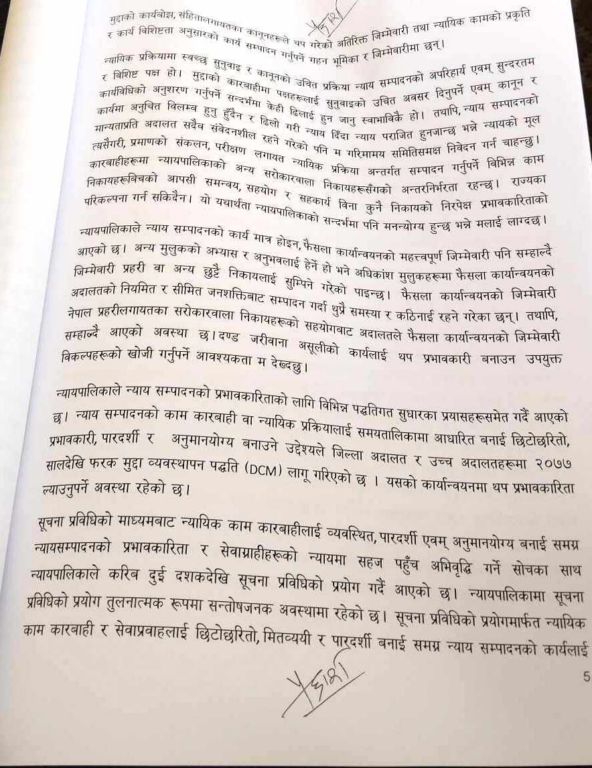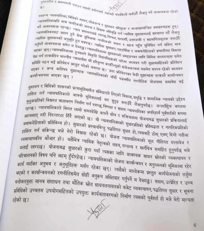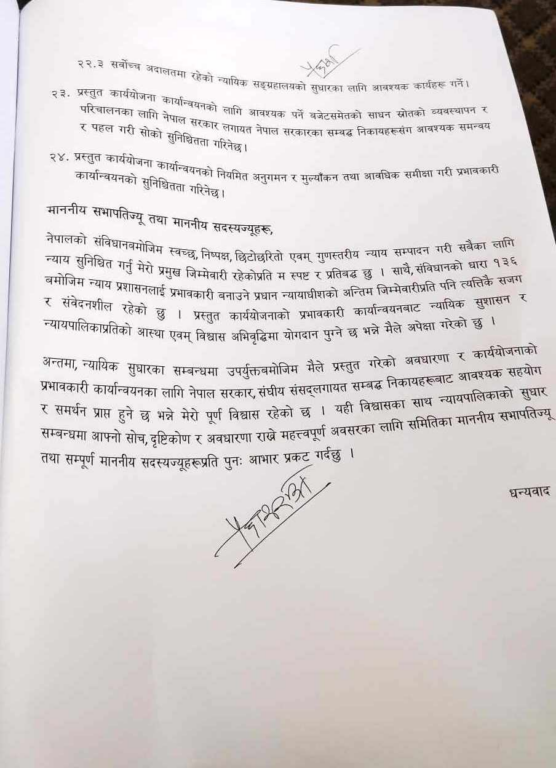 विश्वको विभिन्न देशमा विभिन्न समयमा न्यायपालिकाको सुधारका लागि जारी भएका प्रतिबद्धता अनुसार प्रभावकारी रुपमा सेवा दिन नेपालको न्यायालयहरु समेत सक्षम रहेको उनको धारणा रहेको छ ।