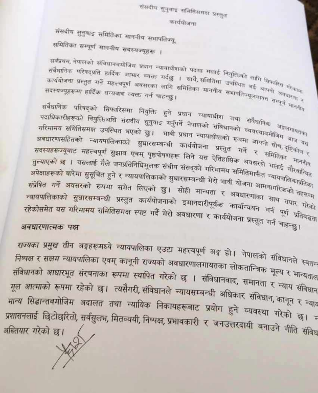 काठमाडौं । प्रधानन्यायाधीशमा प्रस्तावित प्रकाशमानसिंह राउतले आफ्नो कार्ययोजना प्रस्तुत गरेका छन् ।