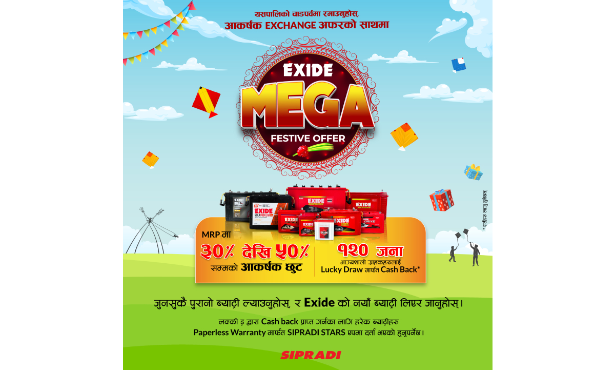 काठमाडौं । एक्साइड इन्डस्ट्रिजको नेपालस्थित आधिकारीक बिक्रेता सिप्रदी ट्रेडिङ्ग प्रालिले चाडपर्व विशेष एक्साइड मेघा फेस्टिभ अफर कार्यक्रम सार्वजनिक गरेको छ ।