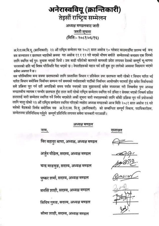 अध्यक्षमण्डलले आज विज्ञप्ति जारी गर्दै सम्मेलन अनिश्चितकालका लागि स्थगित गरिएको जनाएको हो ।