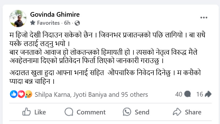 उपरजिस्ट्रार घिमिरेले आफ्नो स्ट्याटसमा भनेका छन्,