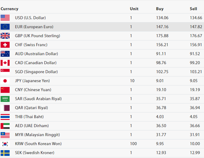 त्यस्तै, युरोको खरिद दर १४७ रुपैयाँ १६ पैसा र बिक्री दर १४७ रुपैयाँ ८२ पैसा, पाउण्ड स्टर्लिङको खरिद दर १७५ रुपैयाँ ८८ पैसा र बिक्री दर १७६ रुपैयाँ ६७ पैसा तोकिएको छ। स्वीस फ्रयाङ्कको खरिद दर १५६ रुपैयाँ २१ पैसा र बिक्री दर १५६ रुपैयाँ ९१ पैसा छ।