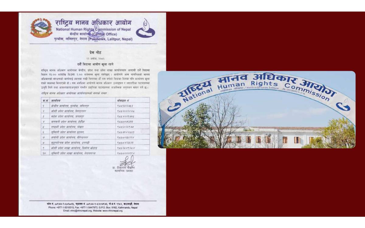 आयोगले आम नागरिकको मानव अधिकारको संरक्षणको कार्यलाई ध्यानमा राखी विगतमा झैँ यस वर्षको बिदाका दिनमा पनि कार्यालय खुला राख्ने व्यवस्था मिलाएको जनाएको छ ।