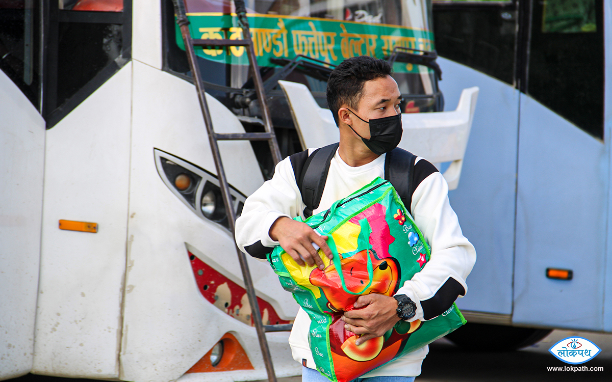 ‘हालसम्म झण्डै १० लाख यात्रुहरु काठमाडौं उपत्यकाबाट बाहिरिनुभएको छ । असोज १४ गतेसम्म ५ लाख ६६ हजारले काठमाडौं उपत्यका छाड्नु भएकोमा घटस्थापनादेखि आजसम्म ४ लाख २२ हजारले काठमाडौं उपत्यका छाड्नुभएको छ,’ कार्कीले लोकपथसँग भने ।