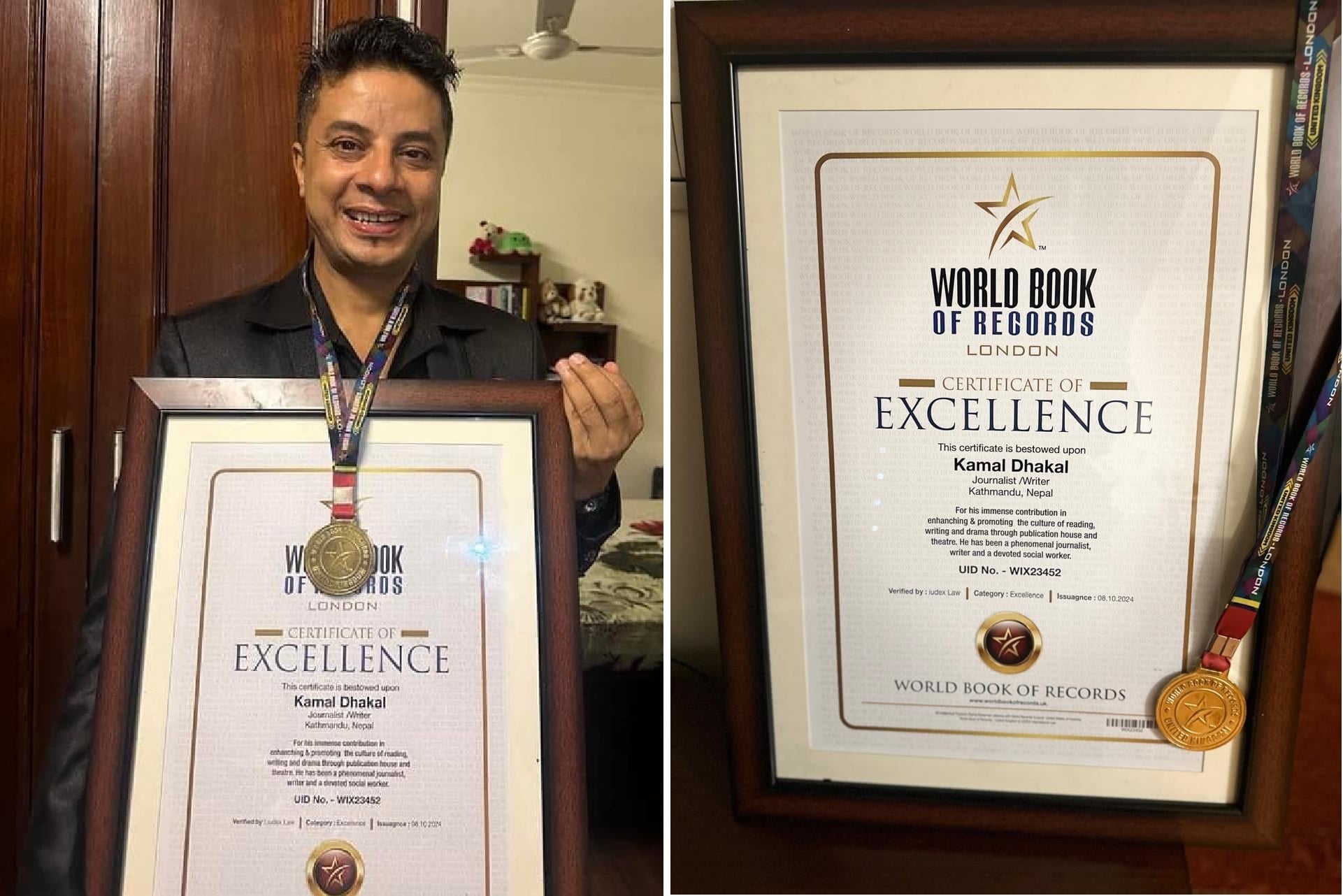 काठमाडौं । लण्डनबाट हरेक वर्ष दिइने ‘वल्र्ड बुक अफ रेकर्ड’ यो वर्षको लागि लेखनकुन्ज नेपालका संस्थापक तथा अध्यक्ष कमल ढकाललाई प्रदान गरिएको छ ।