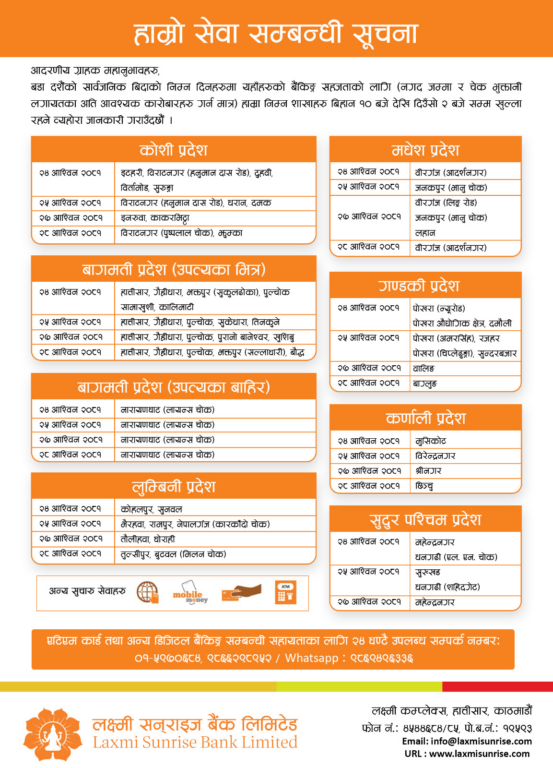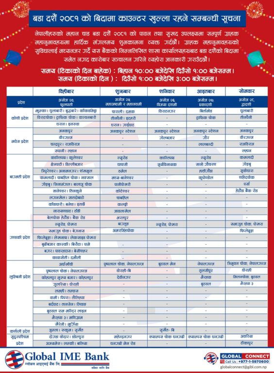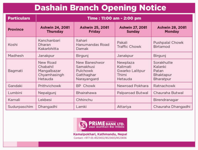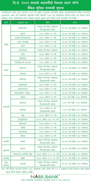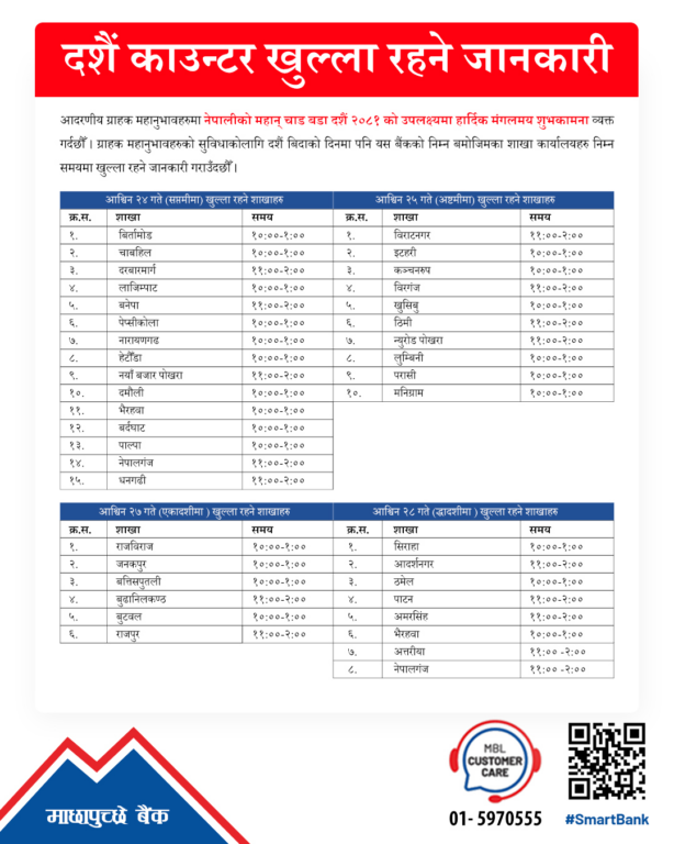यसमध्ये केही बैंकले तुलनात्मक रूपमा धेरै शाखा खोलेर सेवा दिने कार्यतालिका बनाएका छन् भने केहीले निश्चित शाखा कार्यालय खुला गरेर ३ देखि ४ घण्टा मात्रै सेवा दिन लागेका छन् । हेरौँ दसैँ बिदाको समयमा कुन बैंकको कुन शाखा कहिले खुला हुनेछ ।