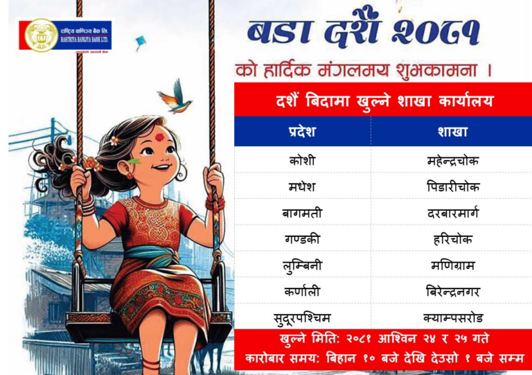 काठमाडौं । आज (बिहीबार) देखि दसैँको दसैँ बिदा सुरु भइसकेको छ । असोज २४ गते देखि अधिकांश क्षेत्रका कार्यालयहरू असोज २८ गते सम्म बन्द रहन्छन् । तर, बैंक तथा वित्तीय संस्थाहरूले भने दसैँ बिदामा पनि आफ्नो सेवा प्रदान गर्ने जनाएका छन् ।