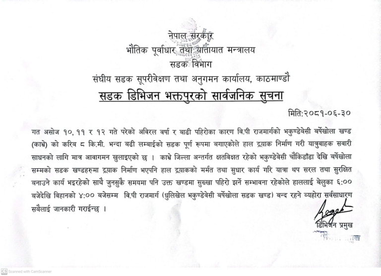 बाढीपहिरो र डुबानले क्षति पुर्याएको भकुण्डेबेसी–वर्षेखोला खण्ड (काभ्रे) को करिब ८ किलोमिटर सडक नयाँ ट्र्याक खोली यात्रुवाहक सवारी साधन सुचारु गरिएकोमा मर्मत र सुधार कार्य भइरहेको जनाउँदै तत्कालका लागि बेलुकी ६ बजेदेखि बिहान ४ बजेसम्मका लागि आवागमन बन्द गरिएको हो ।
