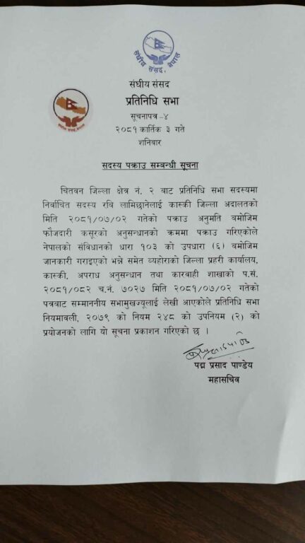 जिल्ला प्रहरी कार्यालय कास्कीले सभामुखलाई त्यससम्बन्धी जानकारी लेखीपठाएको संघीय संसद् सचिवालयका महासचिव पद्मप्रसाद पाण्डेयद्वारा आज जारी सूचनामा उल्लेख छ ।