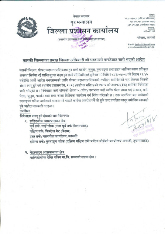 जिल्ला प्रशासन कार्यालय कास्कीले विज्ञप्ति जारी गर्दै प्रदर्शनका क्रममा हुनसक्ने जोखिमलाई मध्यनजर गर्दै विभिन्न क्षेत्रमा निषेधाज्ञा जारी गरेको जनाएको छ ।