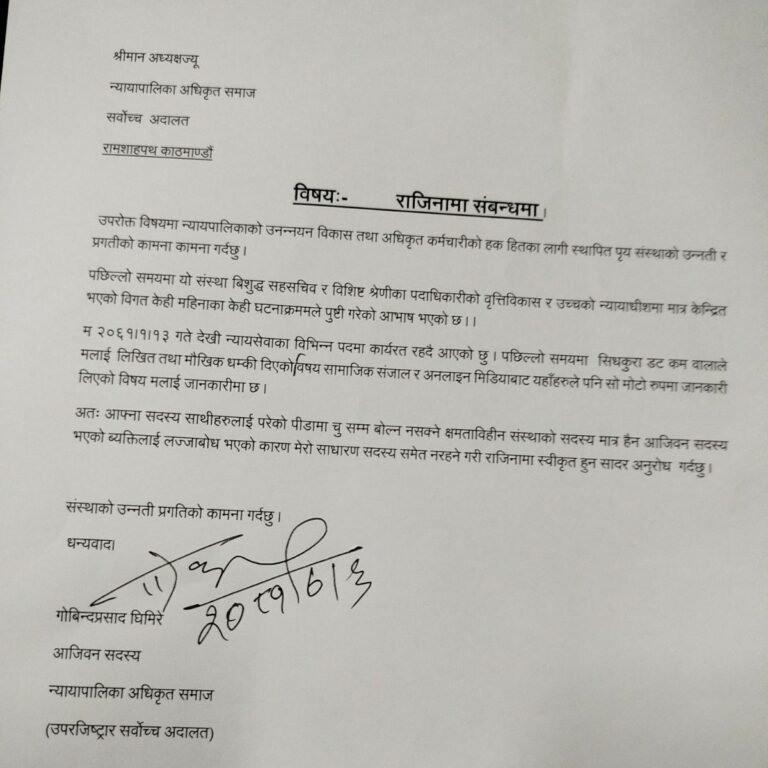 सर्वोच्चका उपरजिस्ट्रार घिमिरेले दिए अधिकृत समाजबाट राजीनामा