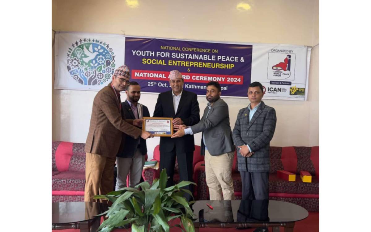 युवाका लागि दिगो शान्ति र सामाजिक उधमशीलता सम्बन्धी राष्ट्रिय सम्मेलन तथा राष्ट्रिय पुरस्कार वितरण कार्यक्रममा संघीय संसद्, प्रतिनिधि सभा राज्य व्यवस्था तथा सुशासन समितिका सभापति रामहरि खतिवडाले पुरस्कृत गरेका हुन् ।