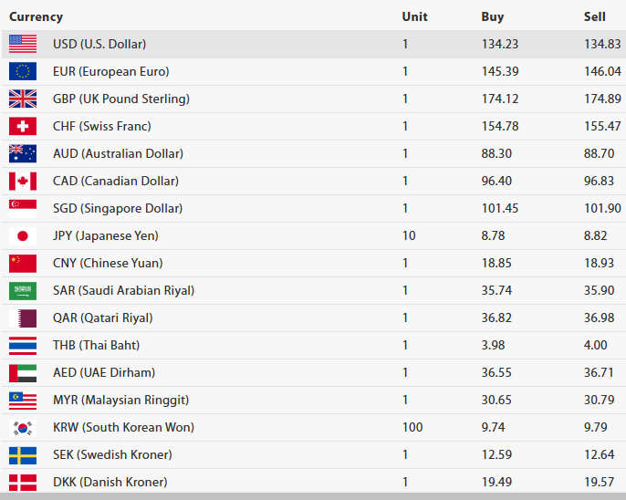 युएई दिराम एकको खरिददर ३६ रुपैयाँ ५५ पैसा र बिक्रीदर ३६ रुपैयाँ ७१ पैसा, मलेसियन रिङ्गेट एकको खरिददर ३० रुपैयाँ ६५ पैसा र बिक्रीदर ३० रुपैयाँ ७० पैसा, साउथ कोरियन वन एक सयको खरिददर नौ रुपैयाँ ९७ पैसा र बिक्रीदर नौ रुपैयाँ ७९ पैसा रहेको राष्ट्र बैंकले जनाएको छ ।