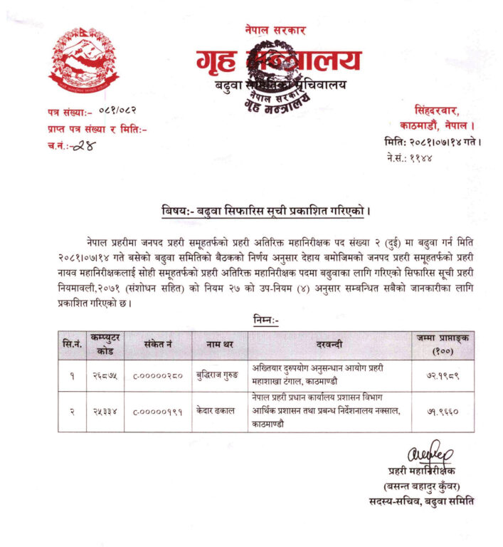 बढुवा सिफारिस भएका एआईजी गुरुङको दरवन्दी अख्तियार दुरुपयोग अनुसन्धान आयोग प्रहरी महाशाखा टंगाल र ढकालको नेपाल प्रहरी प्रधान कार्यालय प्रशासन विभाग आर्थिक प्रशासन तथा प्रबन्ध निर्देशनालय नक्साल रहेको छ ।