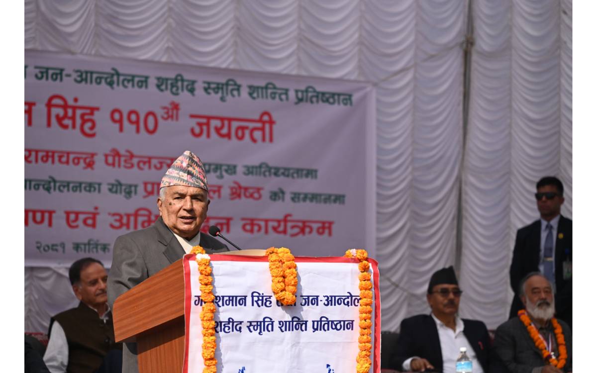 काठमाडौं । राष्ट्रपति रामचन्द्र पौडेलले संघीय लोकतान्त्रिक गणतान्त्रिक शासनप्रणालीको जगमा नै मुलुकको सांस्कृतिक, सामाजिक र आर्थिक विकास गर्न सरकार र राजनीतिक दलहरू चुक्नु नहुने बताएका छन् । राष्ट्रपति रामचन्द्र पौडेलले गणेशमान सिंह तथा जन आन्दोलन सहिद स्मृति शान्ति प्रतिष्ठानद्वारा शनिबार काठमाडौँमा आयोजित गणेशमान सिंह ११० औँ जन्म जयन्ती तथा अभिनन्दन कार्यक्रमलाई संशोधन गर्दै सो धारणा व्यक्त गरेका हुन् ।