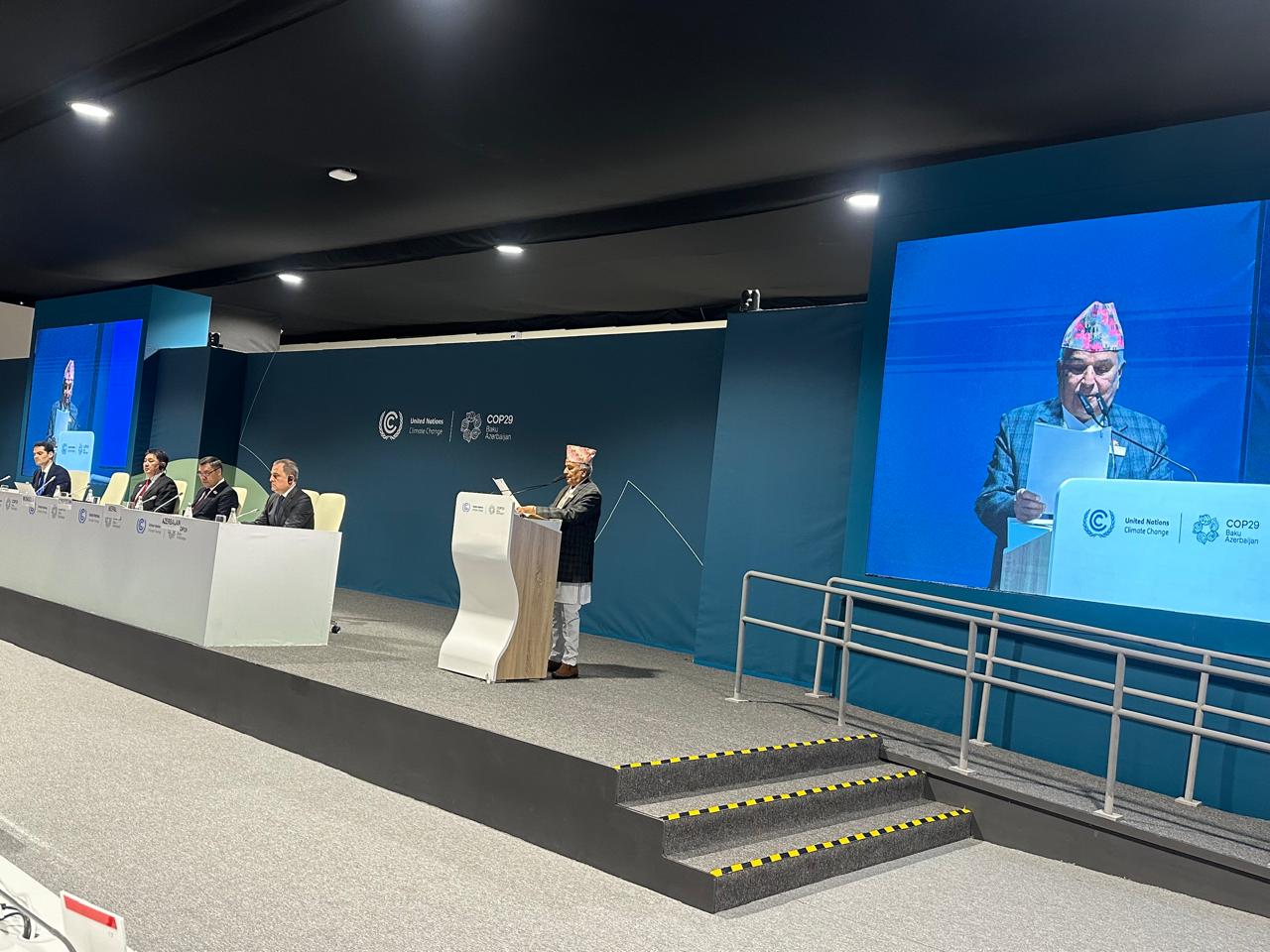 अजरबैजानको बाकु सहरमा यही कात्तिक २६ गतेबाट सुरु भएको जलवायु परिवर्तनसम्बन्धी संयुक्त राष्ट्र संघीय संरचना महासन्धि पक्ष राष्ट्रहरूको २९ औँ सम्मेलन (कोप–२९) अन्तर्गत मंगलबार राष्ट्रपति पौडेलले उच्चस्तरीय सत्रको ‘विश्व नेताहरू जलवायु कार्य शिखर सम्मेलन’लाई सम्बोधन गरेका थिए ।
