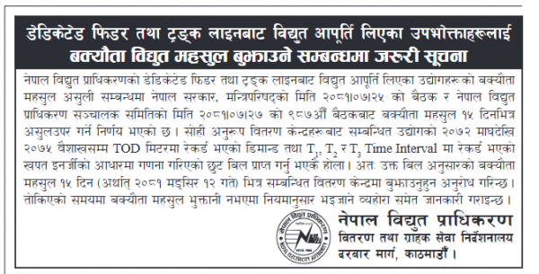 काठमाडौं । नेपाल विद्युत् प्राधिकरणको डेडिकेटेड फिडर तथा ट्रंकलाइनबाट विद्युत् आपूर्ति सुविधा लिएका उद्योगहरूको बक्यौता महसुल आगामी मंसिर १२ गतेभित्र बुझाउन आग्रह गरेको छ ।