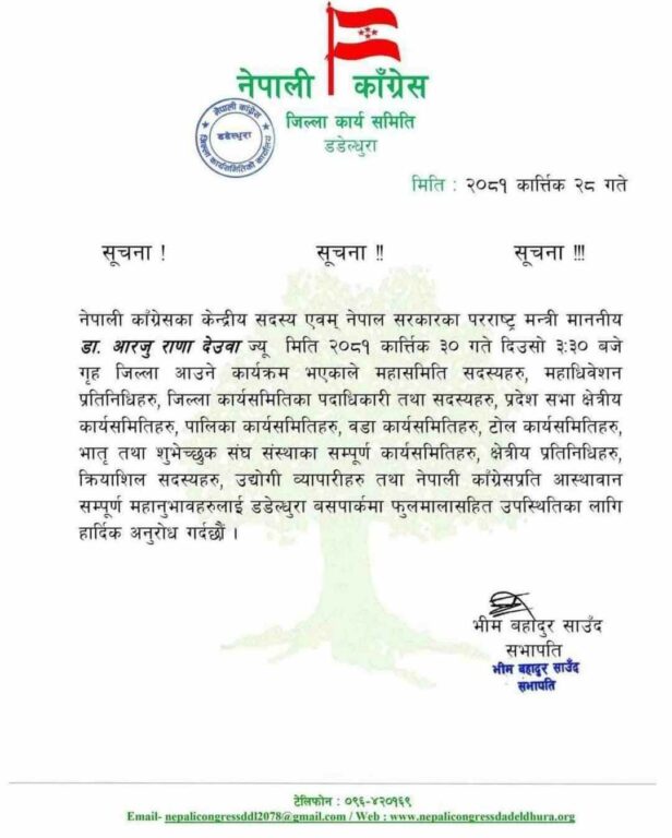 कांग्रेस डडेल्धुारा जिल्ला सभापति भीमबहादुर साउँदले विज्ञप्ति नै निकालेर परराष्ट्र मन्त्री राणा आउँदा डडेल्धुरा बसपार्कमा फूलमालासहित उपस्थित रहन नेता, कार्यकर्ताहरूलाई आदेश दिएका हुन् । डडेल्धुरा बसपार्कमा भेला भएर परराष्ट्रमन्त्री कार्यक्रमलाई स्वागत गर्ने कार्यक्रम छ । सभापति साउँदले महासमिति सदस्यहरू, महाधिवेशन प्रतिनिधिहरू, जिल्ला कार्यसमिति पदाधिकारी र सदस्य, प्रदेश सभा क्षेत्रीय कार्यसमितिहरू, पालिका कार्यसमितिहरू, वडा र टोल कार्यसमितिलाई परराष्ट्र मन्त्री आउने कार्यक्रममा फूलमालासहित उपस्थित रहन भनेका हुन् । साथै क्रियाशील सदस्यहरू, उद्योगी र व्यापारीहरूलगायतलाई पनि फूलमालासहित डडेल्धुरा बसपार्कमा उपस्थित हुन सभापति साउँदको उर्दी छ ।