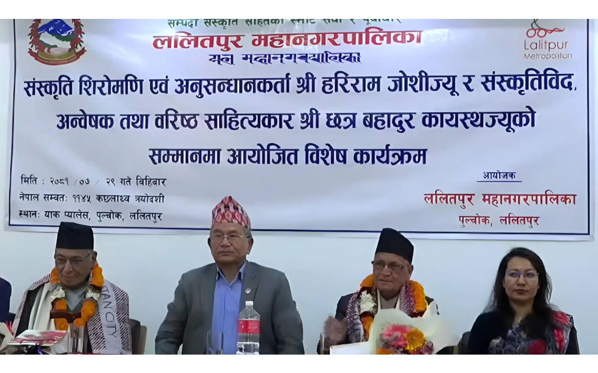 काठमाडौं । ललितपुर महानगरपालिकाले संस्कृति शिरोमणि हरिराम जोशी र संस्कृतिविद्, अन्वेषक एवम् वरिष्ठ साहित्यकार छत्रबहादुर कायस्थलाई सम्मान गरेको छ । साथै नगरपालिकाले उनीहरूका लागि सवारीसाधन, सुरक्षाकर्मी र सञ्चारसाधनको व्यवस्था गर्ने निर्णय समेत गरेको छ ।