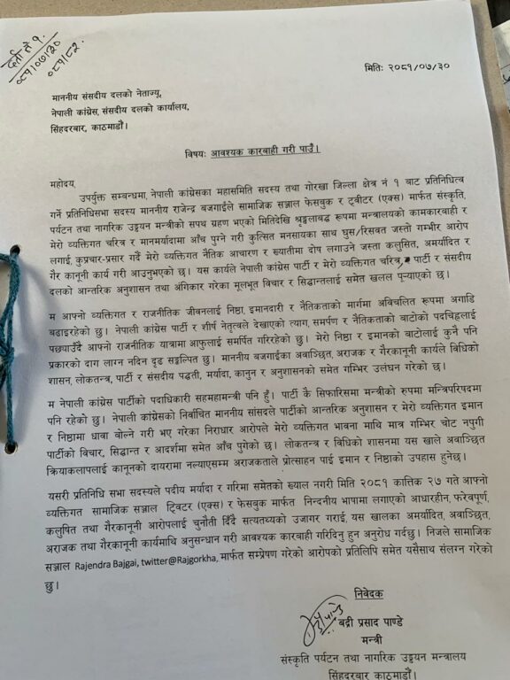 अनुशासन समितिमा बिहीबार र संसदीय दलमा शुक्रबार बुझाइएको उजुरीमा नेपाली कांग्रेसका महासमिति सदस्य तथा गोरखा जिल्ला क्षेत्र नं १ बाट प्रतिनिधित्व गर्ने सांसद तथा पर्यटन व्यवसायी बजगाईलें आफू मन्त्री नियुक्त भएदेखि नै शृखलावद्ध रूपमा विभिन्न आरोप लगाउँदै सामाजिक सञ्जालहरूमा कुप्रचार गर्दै आएको पाण्डेले उजुरीमा उल्लेख गरेका छन् ।