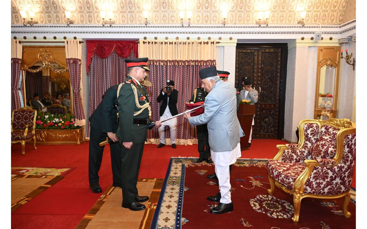 काठमाडौं । राष्ट्रपति रामचन्द्र पौडेलले भारतीय स्थल सेनाध्यक्ष उपेन्द्र द्विवेदीलाई आज मानार्थ महारथीको दर्ज्यानी चिन्ह तथा खड्ग प्रदान गरेका छन् ।
