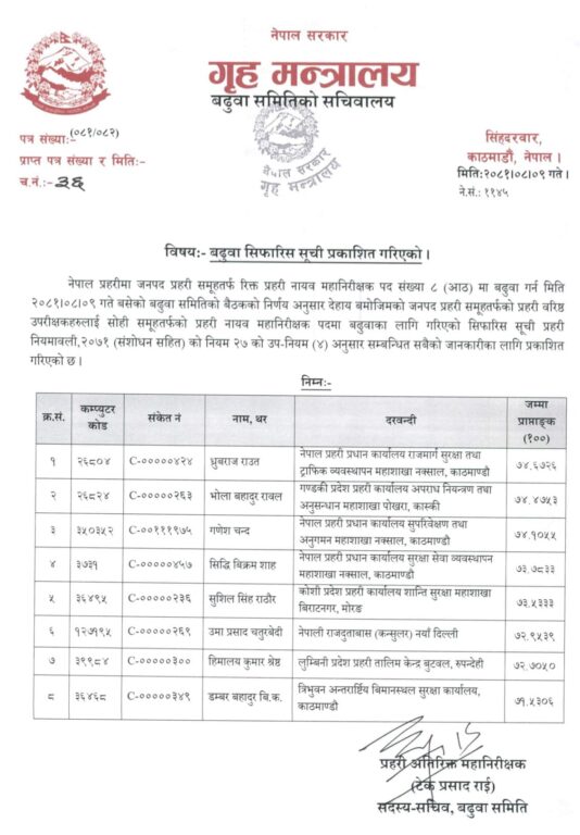 २०५४ चैत १८ गते प्रहरी निरीक्षकबाट प्रहरी सेवामा प्रवेश गरेका दानबहादुर कार्की, डा.मनोज केसी र राजन अधिकारीको टोलीले यो पटक पनि चर्काे लबिइङ गरेकाले उनीहरुभन्दा सिनियरमाथि यो पटक पनि अन्याय हुने सम्भावना थियो । तर रवि लामिछानेले बिगारेको थिति रमेश लेखक नेतृत्वको गृह प्रशासनले यो बढुवा सिफारिसबाट भने लयमा ल्याउन खोजेको देखिन्छ ।