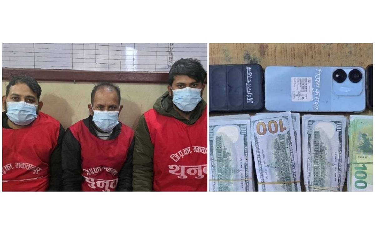 काठमाडौं । प्रहरीले स्रोत नखुलेको ठूलो परिमाणको विदेशी मुद्रासहित तीन जना भारतीय नागरिकलाई पक्राउ गरेको छ । उनीहरुबाट करिब ६३ लाख रुपैयाँबराबरको अमेरिकी डलर र युरो बरामद भएको प्रहरीले जनाएको छ । मकवानपुरको हेटौँडा–भैसे सडकखण्डस्थित चौकीटोल नजिकैको प्रहरी चेकपोइन्टबाट प्रहरीले उनीहरुलाई पक्राउ गरेको हो ।