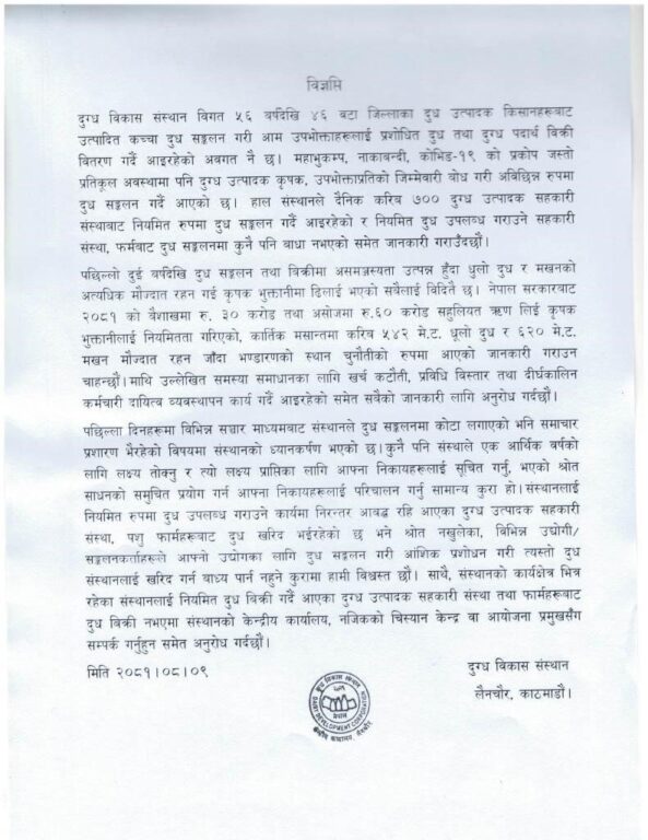 साथै संस्थानको कार्यक्षेत्रभित्र रहेका संस्थानलाई नियमित दूध बिक्री गर्दै आएका दूग्ध उत्पादक सहकारी संस्था तथा फार्महरूबाट दूध बिक्री नभएमा संस्थानको केन्द्रीय कार्यालयमा सम्पर्क गर्नसमेत अनुरोध गरेको छ ।