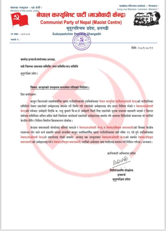 केन्द्रमा विपरित गठबन्धनमा रहेको एमालेलाई समर्थन गरेको भन्दै माओवादी केन्द्रले एकीकृत समाजवादीको उम्मेदवारलाई सहयोग गर्न निर्देशन दिएको हो ।