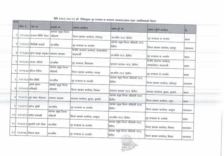 कल्पना घिमिरे, भक्तपुरका सहायक प्रमुख जिल्ला अधिकारी डोरेन्द्र निरौला र धनकुटाका सहायक प्रमुख जिल्ला अधिकारी सहदेव रायमाझीको मन्त्रालयमा सरुवा भएको छ भने चितवनका सहायक प्रमुख जिल्ला अधिकारी सुवासकुमार लामिछानेको कारागार कार्यालय झुम्का, सुनसरीमा सरुवा भएको छ ।