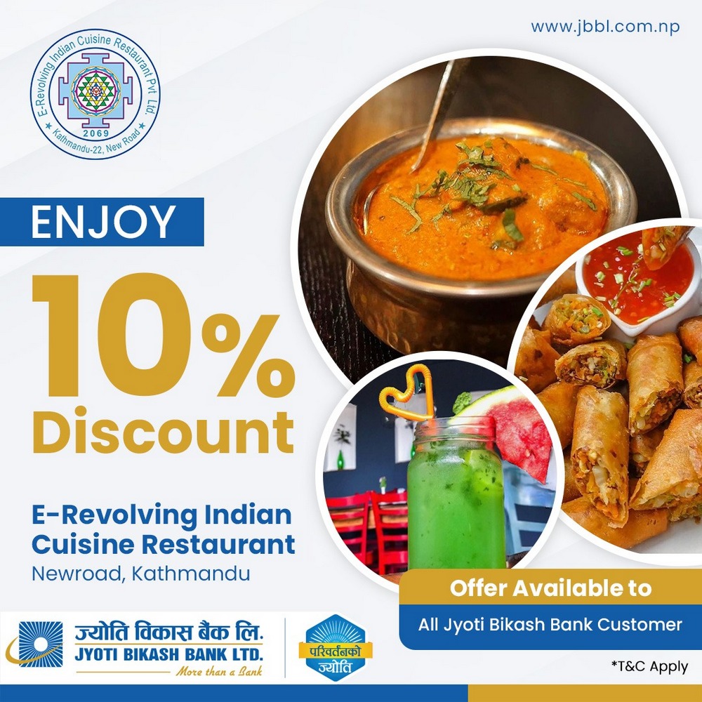 काठमाडौं । ज्योति विकास बैंक लिमिटेडले काठमाडौंस्थित ‘ई–रिभोल्भिङ इन्डियन क्यूसीन रेष्टुरेन्ट’ मा बैंकका ग्राहकहरूलाई १० प्रतिशतसम्मको विशेष छुट प्रदान गर्ने सम्झौता गरेको छ ।