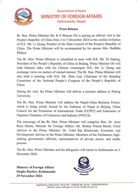 प्रधानमन्त्री ओली चिनियाँ समकक्षी ली छ्याङको निमन्त्रणामा मंसिर १७–२१ ९डिसेम्बर २ देखि ५ सम्म० का लागि चीन भ्रमणमा जाने भएका हुन् । प्रधानमन्त्री ओलीले चिनियाँ राष्ट्रपति सी चिनफिङ र चिनियाँ समकक्षी ली छ्याङसँग छुट्टाछुट्टै औपचारिक वार्ताको पनि तालिका बनेको छ ।