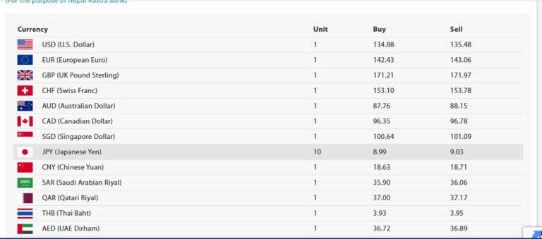 यस्तै, जापानी येन १० को खरिददर आठ रुपैयाँ ९९ पैसा र बिक्रीदर नौ रुपैयाँ ०३ पैसा, चिनियाँ युआन एकको खरिददर १८ रुपैयाँ ६३ पैसा र बिक्रीदर १८ रुपैयाँ ७१ पैसा, साउदी अरेबियन रियाल एकको खरिददर ३५ रुपैयाँ ९० पैसा र बिक्रीदर ३६ रुपैयाँ ०६ पैसा, कतारी रियाल एकको खरिददर ३७ रुपैयाँ र बिक्रीदर ३७ रुपैयाँ १७ पैसा कायम भएको छ ।