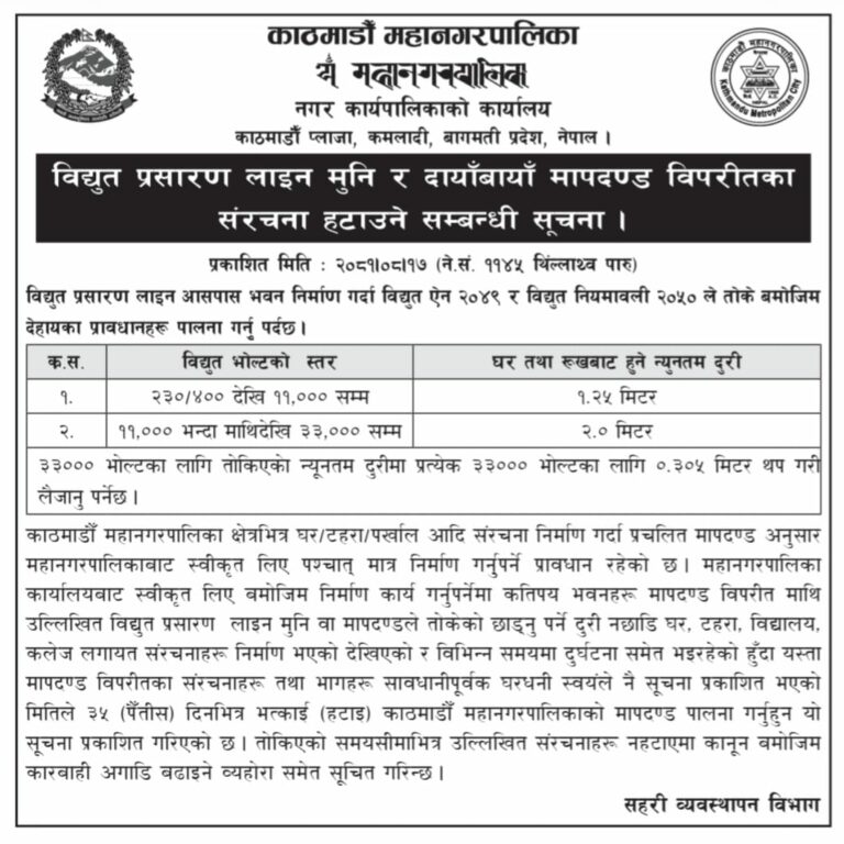 काठमाडौ । काठमाडौं महानगरपालिकाले विद्युत प्रसारण लाइनमुनि रहेका संरचना हटाउन ३५ दिने सूचना जारी गरेको छ । महानगरको सूचनामार्फत बिजुलीको तारमुनि रहेका घर टहरा तथा संरचना हटाएर मापदण्ड पालन गर्न आग्रह गरेको हो ।