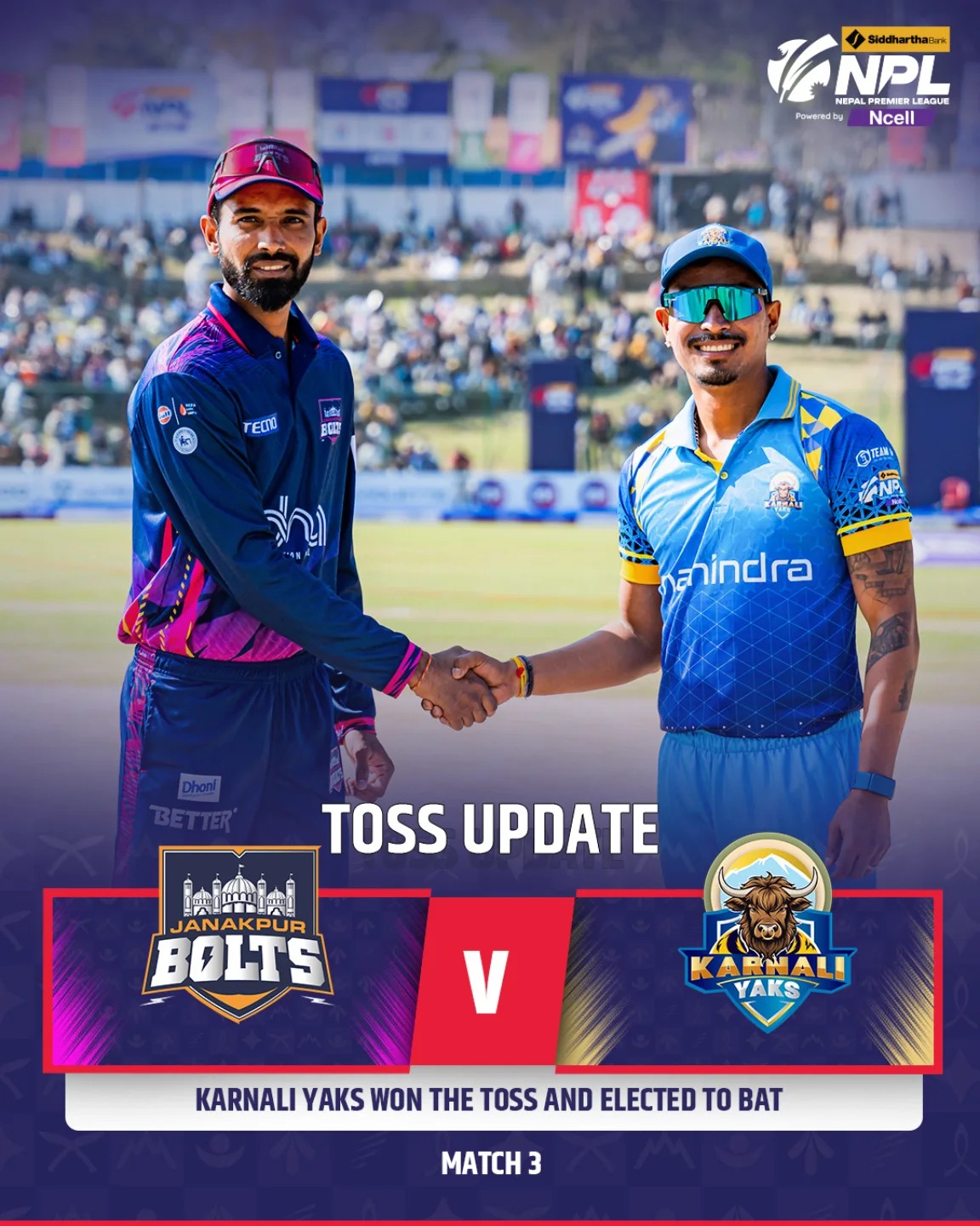 काठमाडौं । नेपाल प्रिमियर लिग (एनपीएल) को तेस्रो खेल अन्तर्गत कर्णाली याक्स र जनकपुर बोटलर्सबीच प्रतिष्पर्धा भइरहेको छ ।