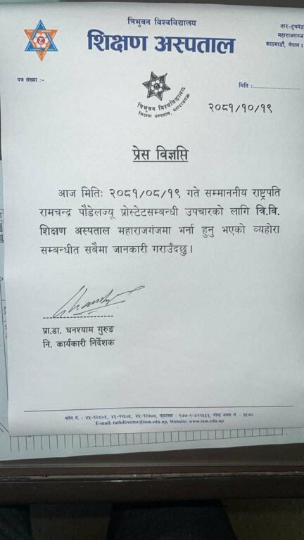 उक्त अस्पतालका निमित्त कार्यकारी निर्देशक प्राध्यापक डाक्टर घनश्याम गुरुङकाअनुसार राष्ट्रपतिलाई आज बिहान उपचारार्थ भर्ना गरिएको हो ।