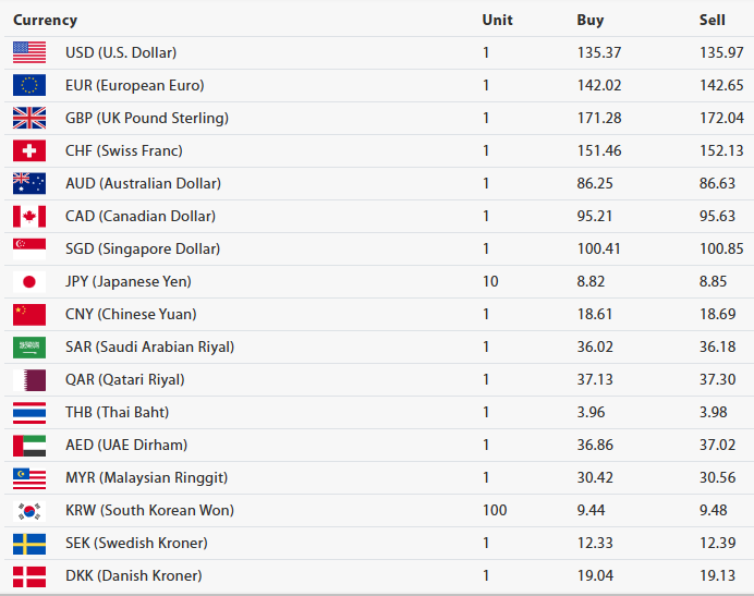 यस्तै, युरोपियन युरो एकको खरिददर एक सय ४२ रुपैयाँ ०२ पैसा र बिक्रीदर एक सय ४२ रुपैयाँ ६५ पैसा, युके पाउन्ड स्ट्रलिङ एकको खरिददर एक सय ७१ रुपैयाँ २८ पैसा र बिक्रीदर एक सय ७२ रुपैयाँ ०४ पैसा, स्विस फ्र्याङ्क एकको खरिदर एक सय ५१ रुपैयाँ ४६ पैसा र बिक्रीदर एक सय ५२ रुपैयाँ १३ पैसा तोकिएको छ ।
