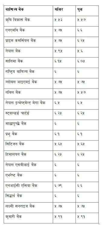 पुस महिनाका लागि कुन बैंकको ब्याजदर कति ?