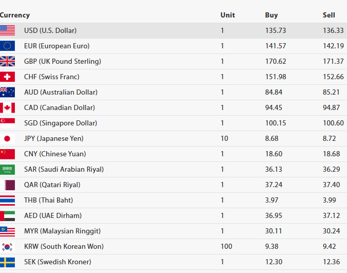 केन्द्रीय बैंकका अनुसार अमेरिकी डलर एकको खरिददर एक सय ३५ रुपैयाँ ७३  पैसा र बिक्रीदर एक सय ३६ रुपैयाँ ३३ पैसा कायम भएको छ । युरो एकको खरिददर एक सय ४१ रुपैयाँ ५७ पैसा र बिक्रीदर एक सय ४२ रुपैयाँ १९ पैसा, युके पाउण्ड स्टर्लिङ एकको खरिददर एक सय ७० रुपैयाँ ६२ पैसा र बिक्रीदर एक सय ७१ रुपैयाँ ३७ पैसा, स्विस फ्र्याङ्क एकको खरिददर एक सय ५१ रुपैयाँ ९८ पैसा र बिक्रीदर एक सय ५२ रुपैयाँ ६६ पैसा कायम गरिएको छ ।