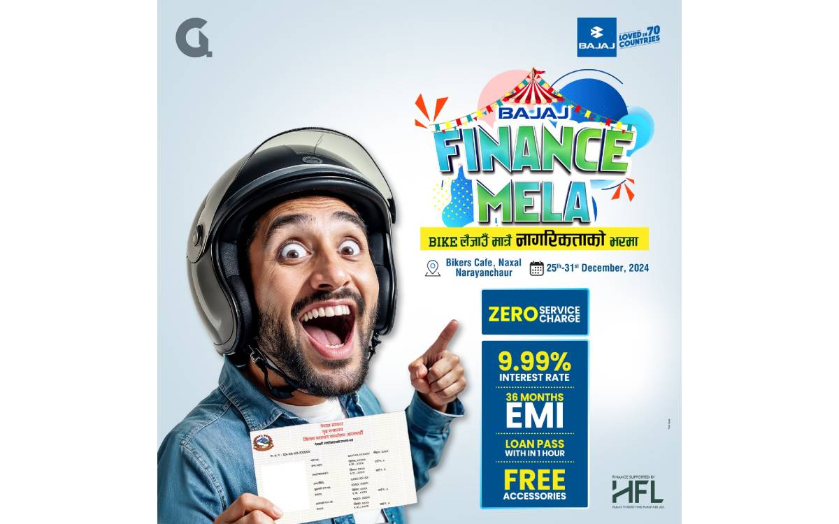 बजाज मोटरसाइकलका ग्राहकहरूका लागि यो फाइनान्स मेला एक सुनौलो अवसर हुनेछ । कार्यक्रममा सहभागी भई यी विशेष अफरहरूको लाभ उठाउन ग्राहकहरूलाई कम्पनीले आग्रह गरेको छ ।