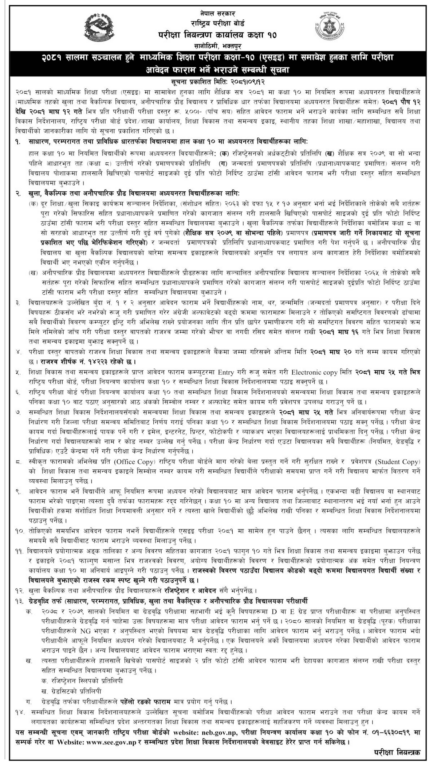 आज एक सूचना जारी गर्दै कार्यालयले शैक्षिक सत्र २०८१ मा कक्षा १० मा नियमित रूपमा अध्ययनरत विद्यार्थीहरूले (माध्यमिक तहको खुला तथा वैकल्पिक विद्यालय, अनौपचारिक प्रौढ विद्यालय र प्राविधिक धार तर्फका विद्यालयमा अध्ययनरत विद्यार्थीहरू समेत) २०८१ पौष १२ देखि २०८१ माघ १२ गते भित्र प्रति परीक्षार्थी परीक्षा दस्तुर पाँच सयसहित आवेदन फाराम भराउन आग्रह गरेको छ ।
