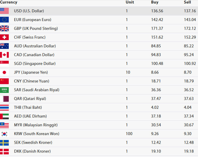 निर्धारित दरअनुसार, अमेरिकी डलर एकको खरिददर एक सय ३६ रुपैयाँ ५६ पैसा र बिक्रीदर एक सय ३७ रुपैयाँ १६ पैसा कायम भएको छ । युरोपियन युरो एकको खरिददर एक सय ४२ रुपैयाँ ४२ पैसा र बिक्रीदर एक सय ४३ रुपैयाँ ०४ पैसा, युके पाउण्ड स्टर्लिङ एकको खरिददर एक सय ७१ रुपैयाँ ३७ पैसा र बिक्रीदर एक सय ७२ रुपैयाँ १२ पैसा, स्वीस फ्र्याङ्क एकको खरिददर एक सय ५१ रुपैयाँ ६२ पैसा र बिक्रीदर एक सय ५२ रुपैयाँ २९ पैसा कायम गरिएको छ ।