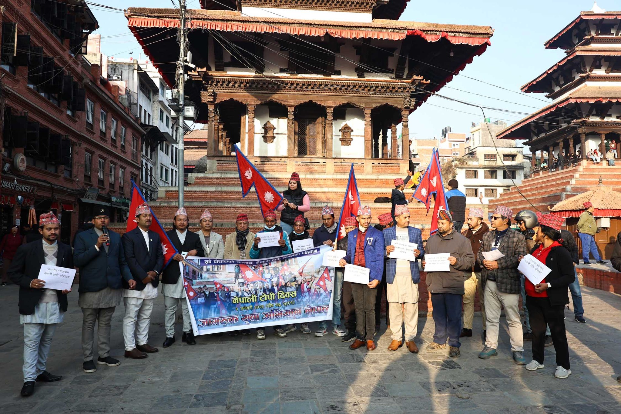 उनीहरुले ‘नेपाली टोपी लगाऔँ, पहिचान बढाऔँ’, ‘हाम्रो राष्ट्रिय पहिचान खै ?’, ‘विश्वको पहिचान पढौँ, नेपाली पहिचान तोकौँ,’ ‘सामुदायिक टोपीको सम्मान, तपाईं हाम्रो अभियान’ जस्ता नारा लेखिएका प्लेकार्ड बोकेर प्रदर्शन गरेका थिए ।