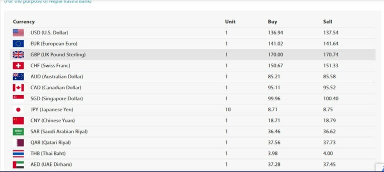 केन्द्रीय बैंकले तोकेको विनिमयदर अनुसार, अमेरिकी डलर एकको खरिददर एक सय ३६ रुपैयाँ ९४ पैसा र बिक्रीदर एक सय ३७ रुपैयाँ ५४ पैसा कायम भएको छ । युरोपियन युरो एकको खरिददर एक सय ४१ रुपैयाँ ०२ पैसा र बिक्रीदर एक सय ४१ रुपैयाँ ६४ पैसा, युके पाउन्ड स्टर्लिङ एकको खरिददर एक सय ७० रुपैयाँ बिक्रीदर एक सय ७० रुपैयाँ ७४ पैसा , स्विस फ्र्याङ्क एकको खरिददर एक सय ५० रुपैयाँ ६७ पैसा र बिक्रीदर एक सय ५१ रुपैयाँ ३३ पैसा कायम गरिएको छ ।