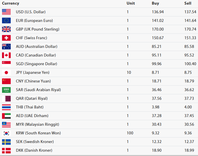केन्द्रीय बैंकले तोकेको विनिमयदरअनुसार, अमेरिकी डलर एकको खरिददर एक सय ३६ रुपैयाँ ९४ पैसा र बिक्रीदर एक सय ३७ रुपैयाँ ५४ पैसा कायम भएको छ । युरोपियन युरो एकको खरिददर एक सय ४१ रुपैयाँ ०२ पैसा र बिक्रीदर एक सय ४१ रुपैयाँ ६४ पैसा, युके पाउन्ड स्टर्लिङ एकको खरिददर एक सय ७० रुपैयाँ र बिक्रीदर एक सय ७० रुपैयाँ ७४ पैसा, स्वीस फ्र्याङ्क एकको खरिददर एक सय ५० रुपैयाँ ६७ पैसा र बिक्रीदर एक सय ५१ रुपैयाँ ३३ पैसा कायम गरिएको छ ।