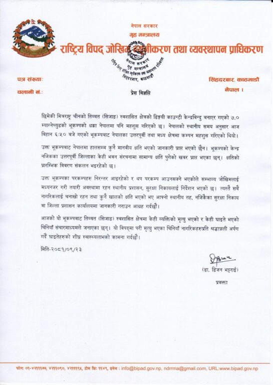 ‘उक्त भूकम्पबाट नेपालमा हालसम्म कुनै मानवीय क्षति भएको जानकारी प्राप्त भएको छैन । भूकम्पको केन्द्र नजिकका जिल्लाका केही भवन संरचनामा सामान्य क्षति पुगेको खबर प्राप्त भएका छन् । क्षतिको प्रारम्भिक विवरण संकलन भइरहेको छ,’ जारी विज्ञप्तिमा भनिएको छ ।
