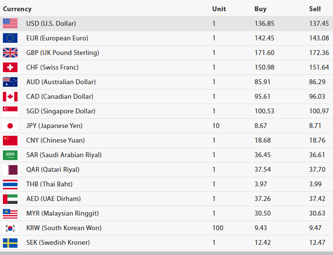 राष्ट्र बैंकले हङ्कङ डलर एकको खरिददर १७ रुपैयाँ ६० पैसा र बिक्रीदर १७ रुपैयाँ ६८ पैसा, कुवेती दिनार एकको खरिददर चार सय ४३ रुपैयाँ ९३ पैसा र बिक्रीदर चार सय ४५ रुपैयाँ ८८ पैसा, बहराइन दिनार एकको खरिददर तीन सय ६३ रुपैयाँ ०३ पैसा र बिक्रीदर तीन सय ६४ रुपैयाँ ६२ पैसा, ओमनी रियाल एकको खरिददर तीन सय ५५ रुपैयाँ ४६ पैसा र बिक्रीदर तीन सय ५७ रुपैयाँ ०२ पैसा तोकिएको छ । त्यसैगरी, भारतीय रुपैयाँ एक सयको खरिददर एक सय ६० रुपैयाँ र बिक्रीदर एक सय ६० रुपैयाँ १५ पैसा तोकिएको छ ।