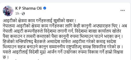उनले सामाजिक सञ्जाल फेसबुकमार्फत नेपालमा आइटीको क्षेत्रमा काम गर्नेहरूका लागि केही कानुनी अप्ठ्यारा रहेको उल्लेख गर्दै शुक्रबारको मन्त्रिपरिषद्को बैठकले अध्यादेशमार्फत सम्बोधन गरेको बताएका हुन् ।