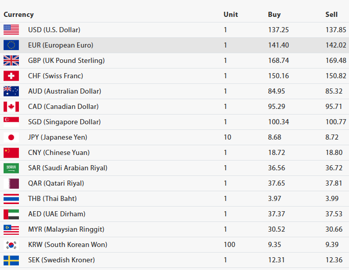 युरोपियन युरो एकको खरिददर एक सय ४१ रुपैयाँ ४० पैसा र बिक्रीदर एक सय ४१ रुपैयाँ ०२ पैसा, युके पाउन्ड स्ट्रलिङ एकको खरिददर एक सय ६८ रुपैयाँ ७४ पैसा र बिक्रीदर एक सय ६९ रुपैयाँ ४८ पैसा, स्वीस फ्र्याङ्क एकको खरिददर एक सय ५० रुपैयाँ १६ पैसा र बिक्रीदर एक सय ५० रुपैयाँ ८२ पैसा कायम गरिएको छ ।