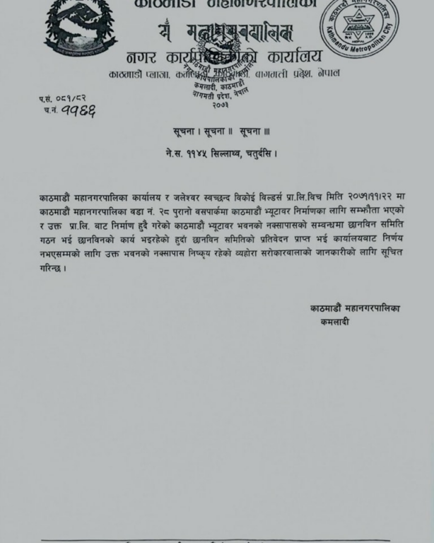 महानगरले आज एक सूचना जारी गर्दै काठमाडौं महानगरको वडा नं.२८ स्थित पुरानो बसपार्कमा निर्माणाधीन उक्त भवनको नक्सा पासबारे छानबिन समिति गठन भइरहेको र समितिबाट प्रतिवेदन प्राप्त भएर कार्यालयबाट निर्णय नहुँदासम्मका लागि नक्सा पास निष्क्रिय रहेको जनाएको हो।